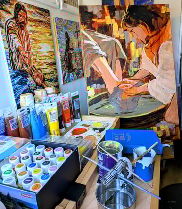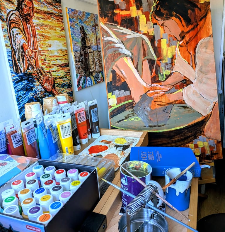 Tom works exclusively in acrylic paintings. He previously painted landscapes inspired by his travels, but has since moved to Biblical subjects, to help explore and showcase the gospels. Initially he took inspiration from AI generated images he saw online, painting his own versions on paper. However, he wanted to really explore his own understanding of these stories, so he went back to learning about how to bring together his own images, reading many books on drawing forms, painting techniques, colour theory, and drawing from imagination, as well as studying further the stories of the Bible to get a greater understanding of the scenes.